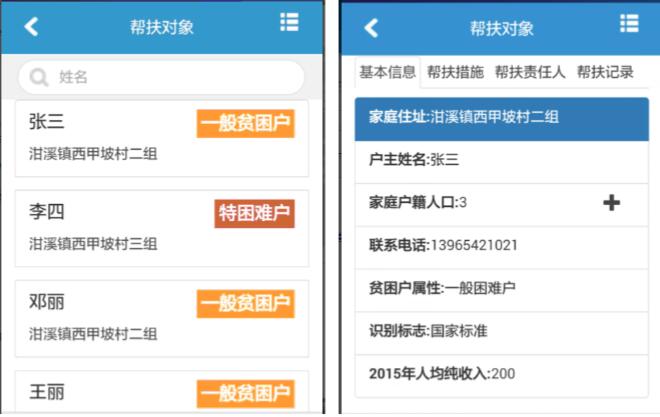 主要是建立和查看貧困戶檔案,包括家庭信息、家庭成員信息、收入情況、房屋情況、致貧原因等,包括幫扶干部制定的幫扶措施、具體責(zé)任人、幫扶記錄等也可以通過(guò)系統(tǒng)查看。