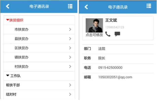 系統(tǒng)提供電子通訊錄功能,可以通過(guò)APP快速查找各級(jí)扶貧組織、幫扶單位、工作隊(duì)、幫扶干部、幫扶對(duì)象的通訊錄,基于通訊錄可以拔打電話和發(fā)送短信,便于大家溝通交流。