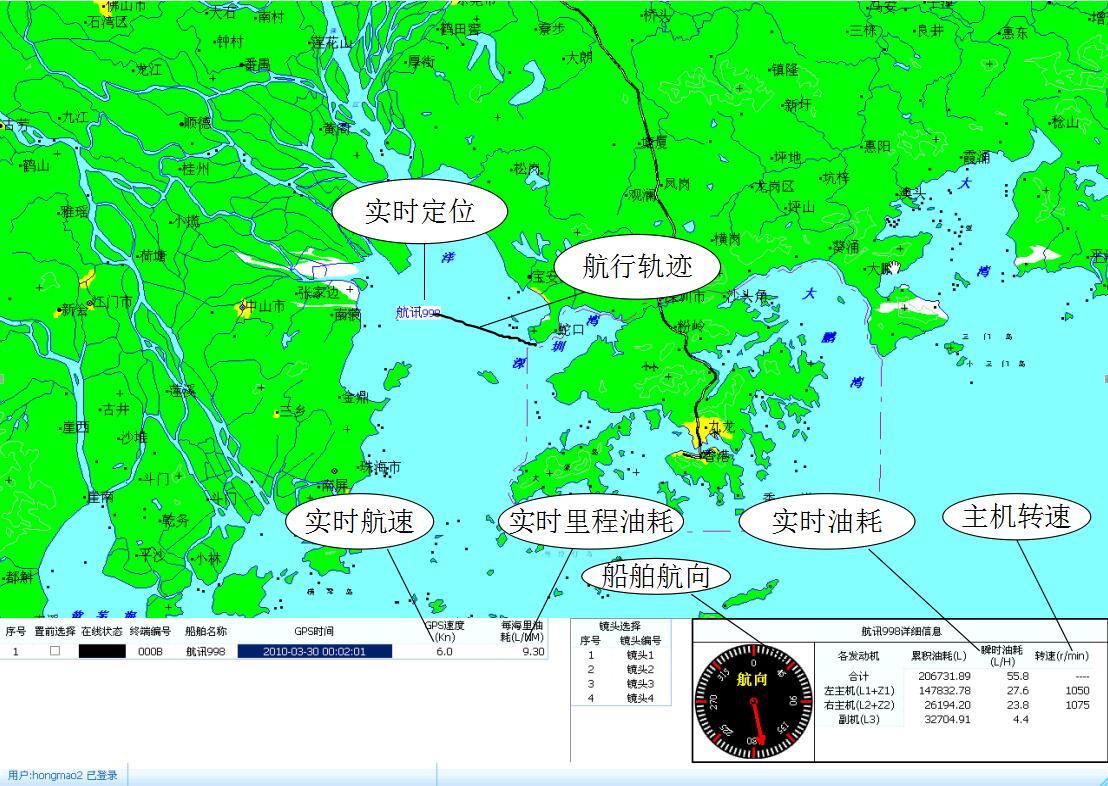 5、用戶監(jiān)控端:GIS系統(tǒng)顯示船舶GPS定位信息,實時顯示船舶發(fā)動機油耗和轉(zhuǎn)速數(shù)據(jù),顯示船舶位移油耗指標(biāo),船舶航行軌跡回放,油耗統(tǒng)計和報表生成等。