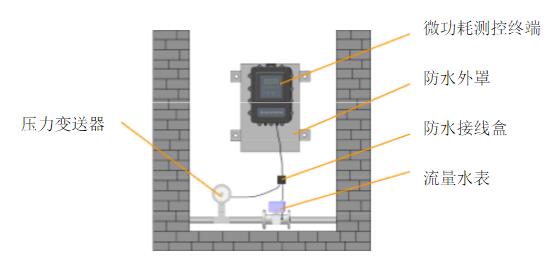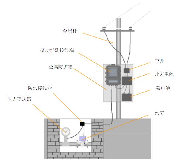 將微功耗測控終端、開關(guān)電源、蓄電池等集成在金屬防護箱內(nèi)。金屬防護箱安裝在金屬桿上。壓力變送器信號線、水表信號線接在防水接線盒上。