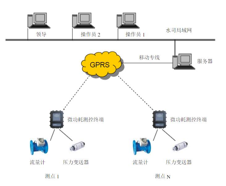 該系統(tǒng)是水司供水調(diào)度管理系統(tǒng)的一個子系統(tǒng),主要由水司調(diào)度中心、通信平臺、監(jiān)測終端、壓力變送器和流量儀表組成。