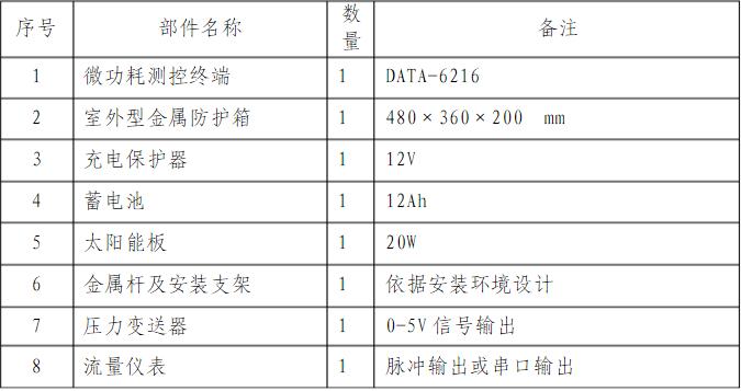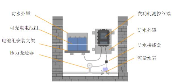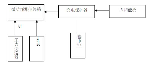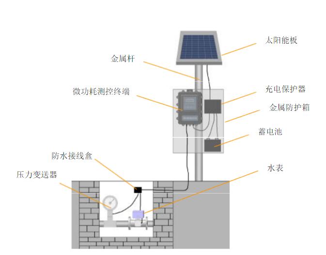 將微功耗測控終端、充電保護器、蓄電池等集成在金屬防護箱內(nèi)。金屬防護箱安裝在金屬桿上。太陽能板安裝在金屬桿上的支架上。壓力變送器信號線、水表信號線接在防水接線盒上。